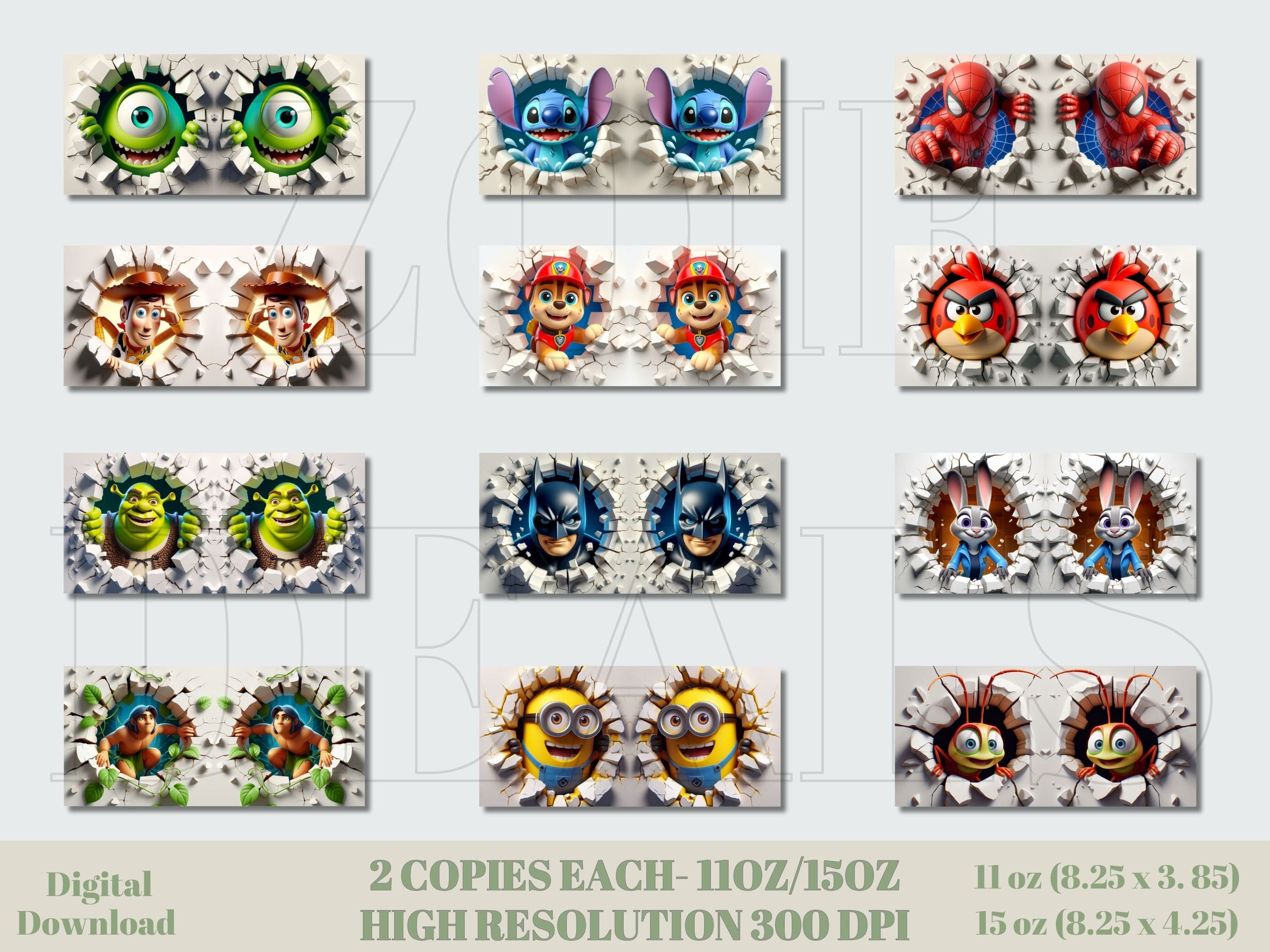 Create eye-catching drinkware with this Cartoon Mug Wrap Bundle featuring 12 unique 3D-style designs optimized for sublimation printing. Each wrap is provided in both 11 oz and 15 oz sizes, giving you ready-to-use templates for standard coated mugs without the need for resizing.