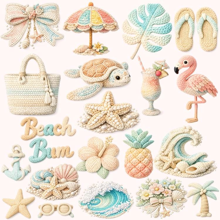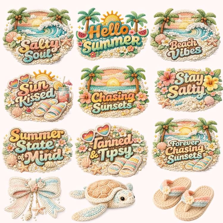 Create cozy seasonal products with this Summer Faux Yarn Bundle, featuring 65 embroidery-style designs with a knitted texture effect. Perfect for beach lovers and summer creators, these graphics blend warm-weather themes with a unique handmade aesthetic.
