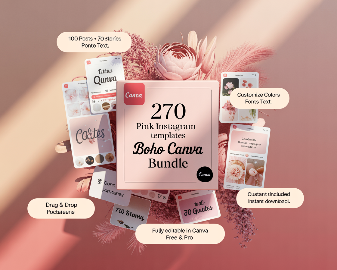 270 Pink Instagram Templates | Pink Social Media Templates| Boho Canva Templates | Instagram Post and story Templates | Engagement templates