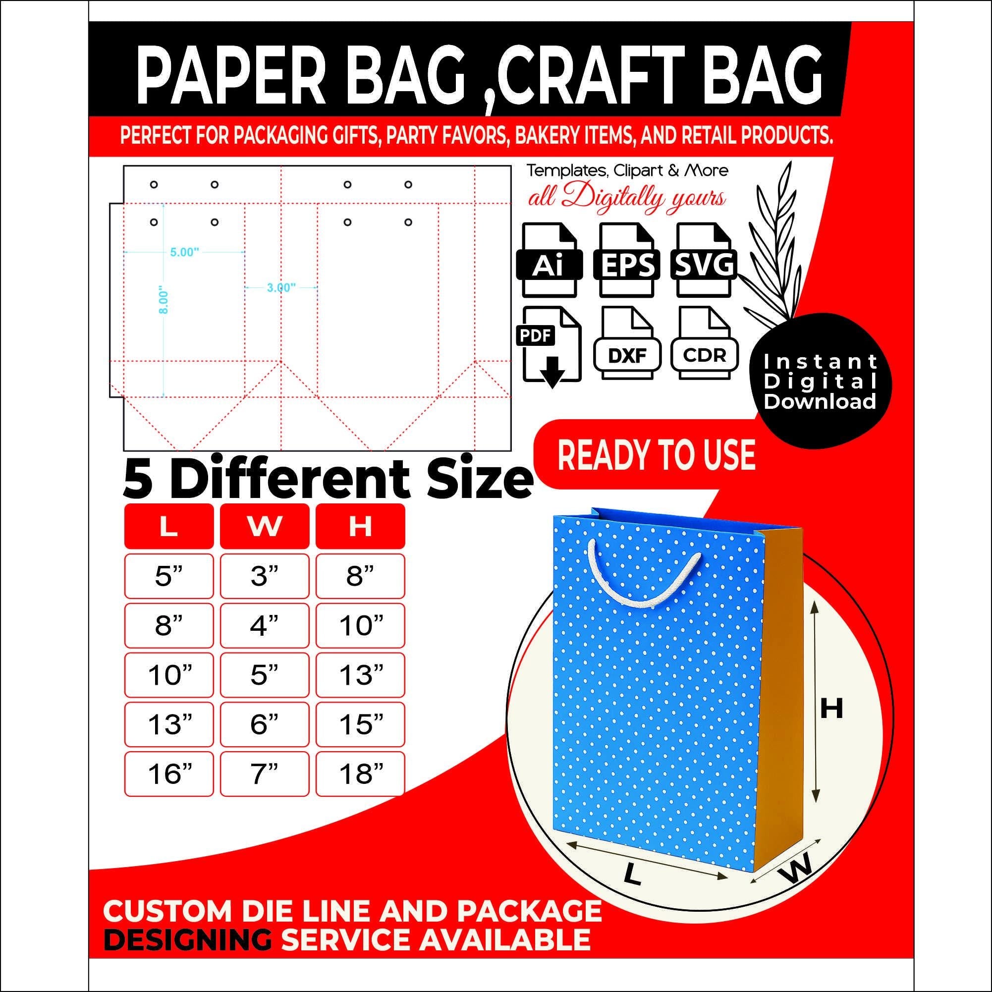 This 5-piece dieline bundle delivers crisp, editable templates for crafting professional kraft gift bags and small shopping bags with ease. Each file is arranged with clear cut lines, fold lines, and bleed guides for clean assembly and reliable printing.