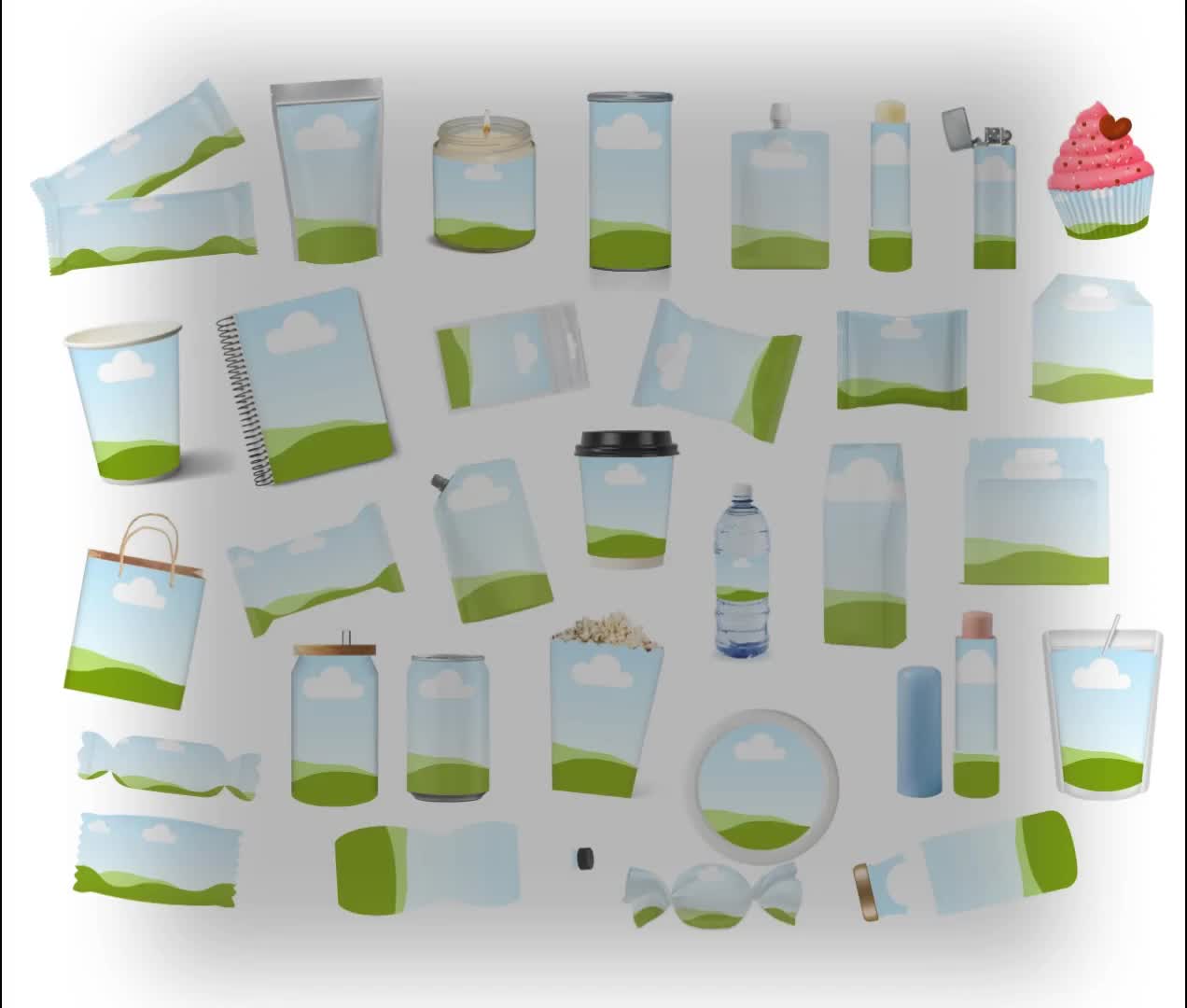 60 editable party favor mockups (boxes, wrappers, pouches, bars, labels, cups) |