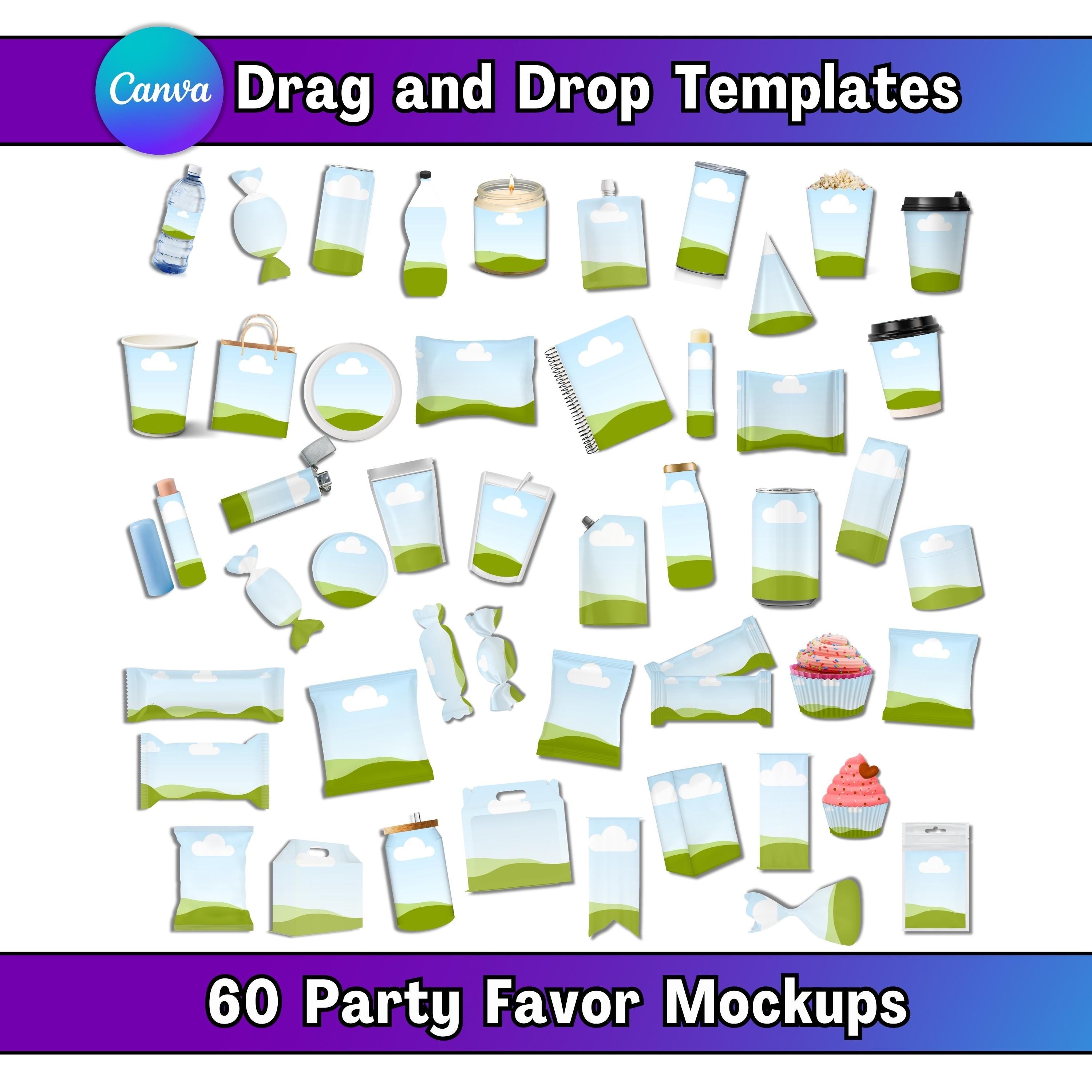 A joyful pack of 60 editable party favor mockups designed for quick customization in Canva. Your download arrives instantly with a PDF linking to both Canva and Google Drive, so you can start creating right away.
