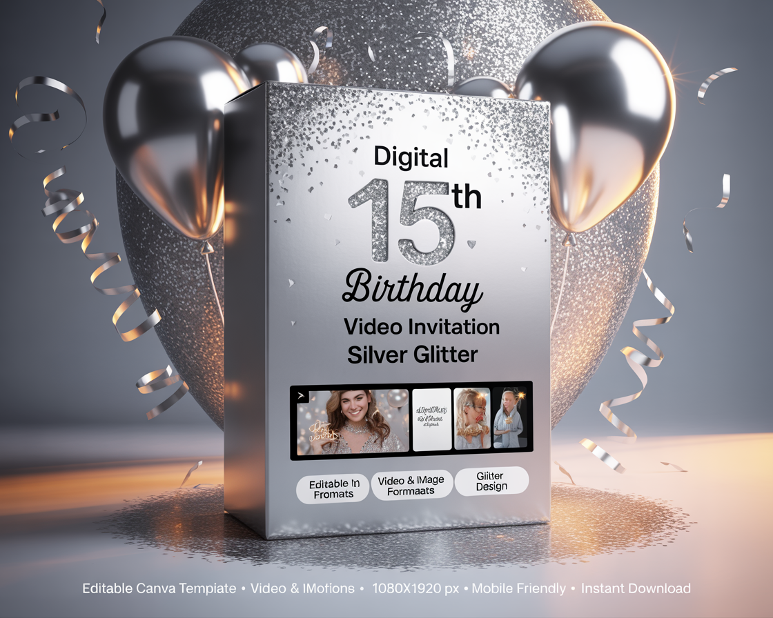 Celebrate your milestone 15th birthday in style with this Silver Glitter Digital Video Invitation. Designed in Canva, this elegant mobile-friendly invite is fully editable, making it perfect for a quinceañera, sweet fifteen, or glamorous birthday celebration. Easily personalize your event details and share instantly via text, WhatsApp, or social media for a quick, modern, and eco-friendly way to invite your guests.