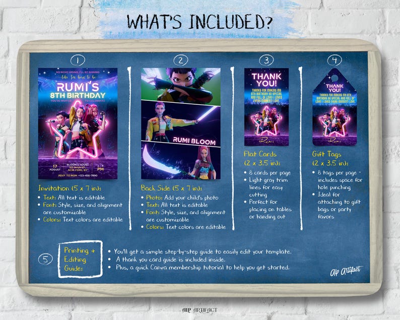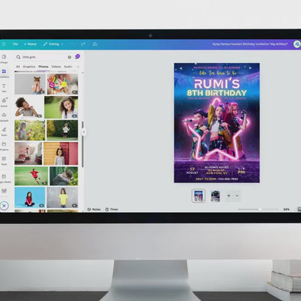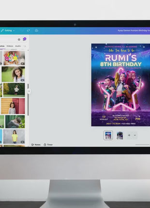 Step into the spotlight with this vibrant and chic Kpop Demon Hunters Stars invitation! Featuring colorful tones and energetic anime characters like Rumi, Zoey, and Mira, this editable Canva template is perfect for fans of K-Pop and anime. Customize in minutes and share digitally or print for a truly unique celebration.