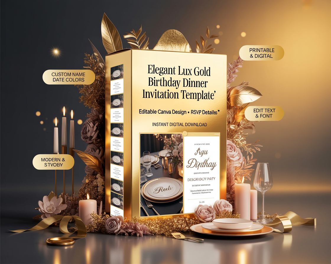 ✨ Elegant Lux Gold Birthday Dinner Invitation – Editable Canva Template ✨