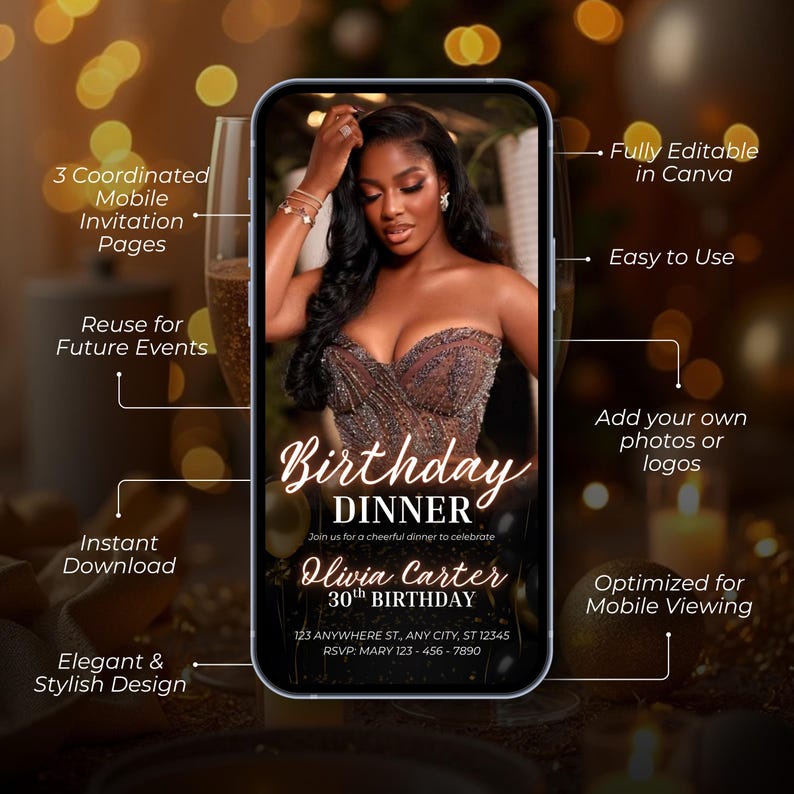 Celebrate in style with this luxurious gold-themed digital invitation, perfect for milestone birthdays, elegant dinners, and special celebrations. Instantly editable in Canva, this chic invite makes it easy to customize and share with friends and family.