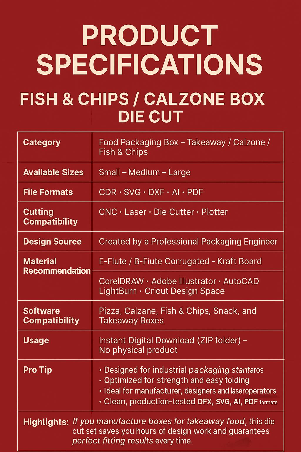 This Fish & Chips / Calzone Die-Cut Box Template Set delivers industry-standard dielines for fast, reliable packaging production. Three scalable sizes (Small, Medium, Large) accommodate everything from snacks to full-size calzones, folding cleanly on laser cutters, die-cut machines, and plotters.