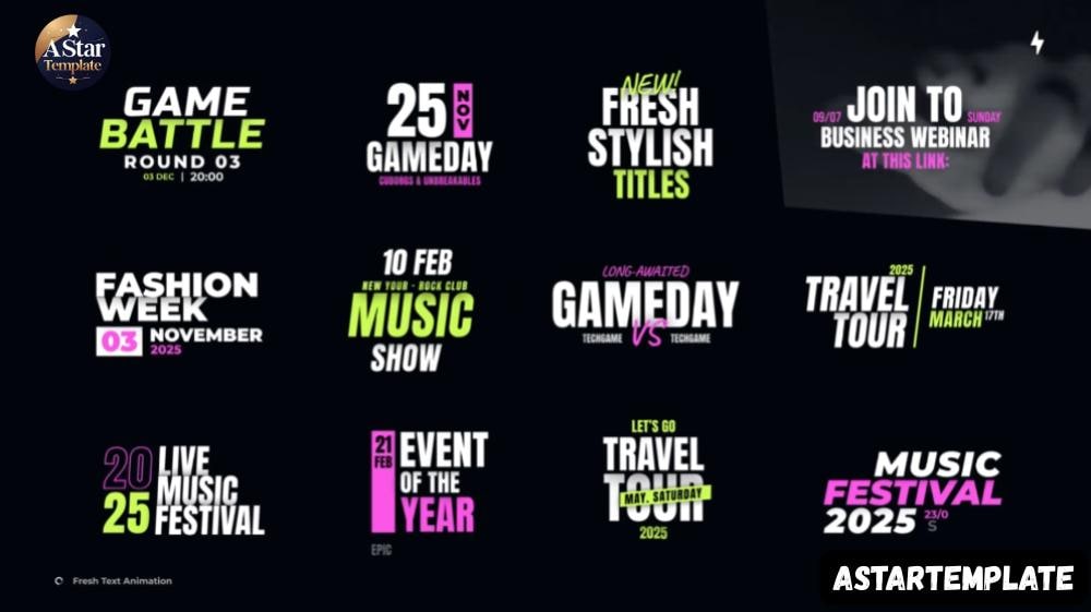 Includes 12 customizable 4K text animations with bold motion, smooth easing, and modular layer control.