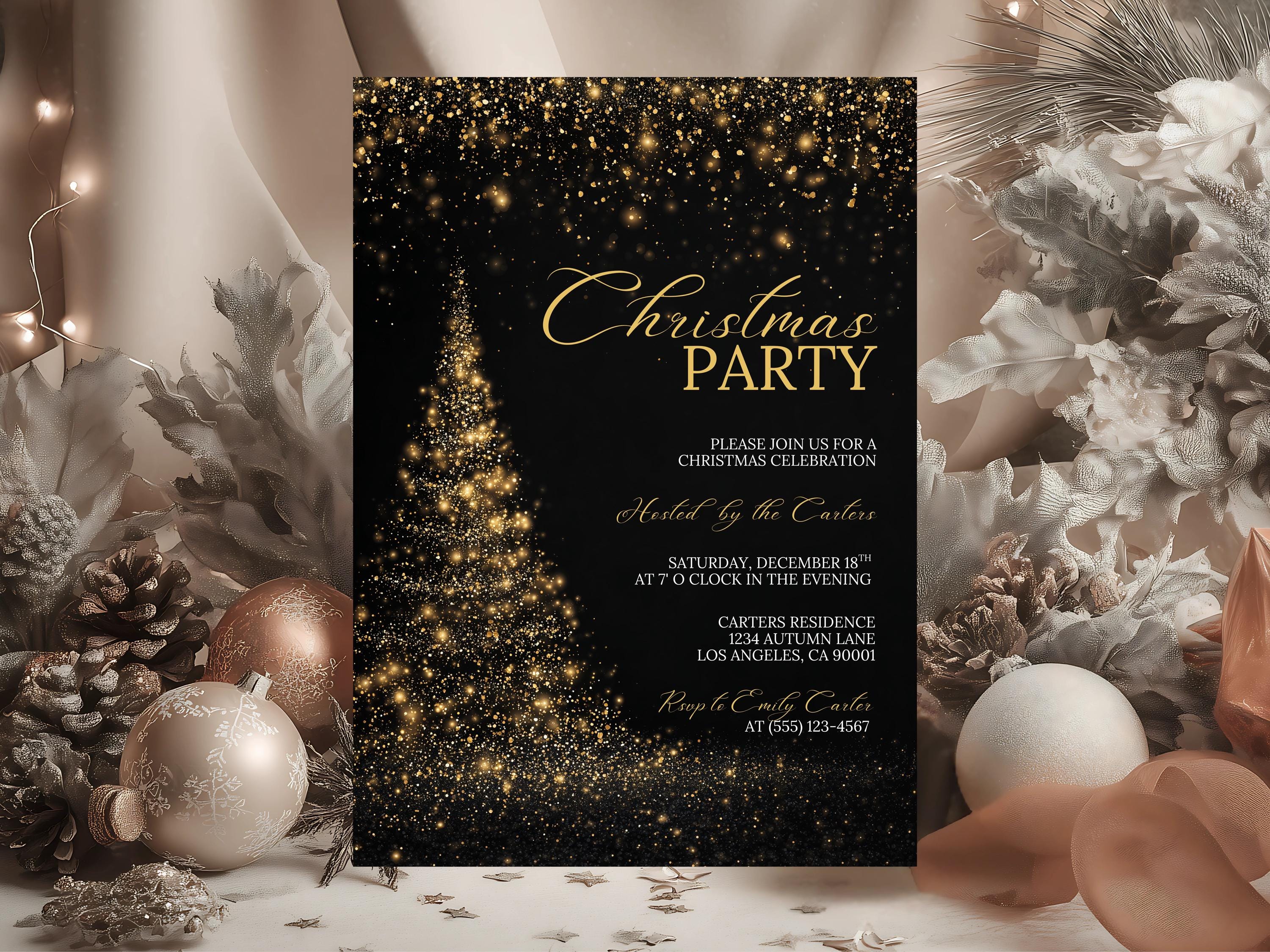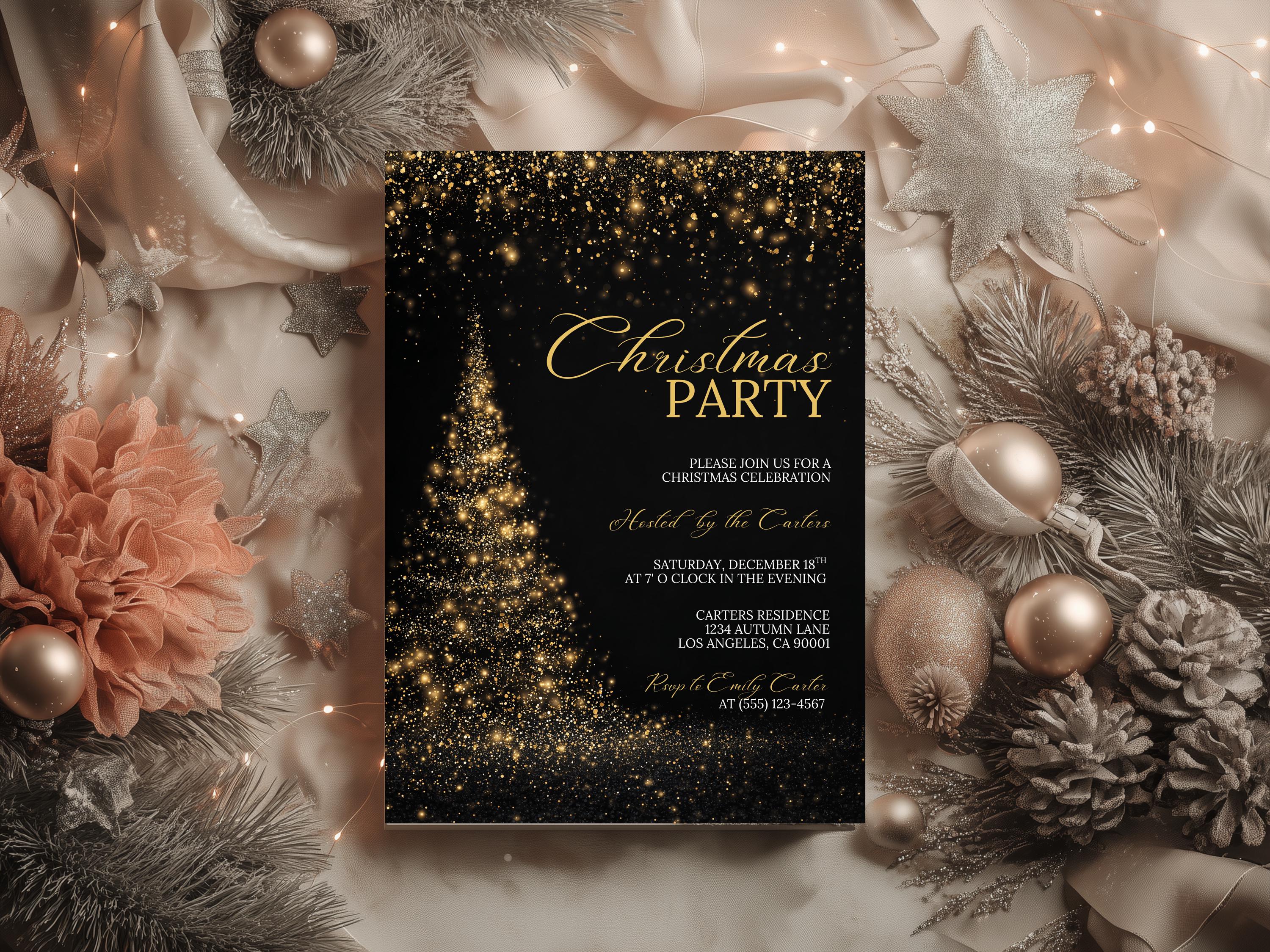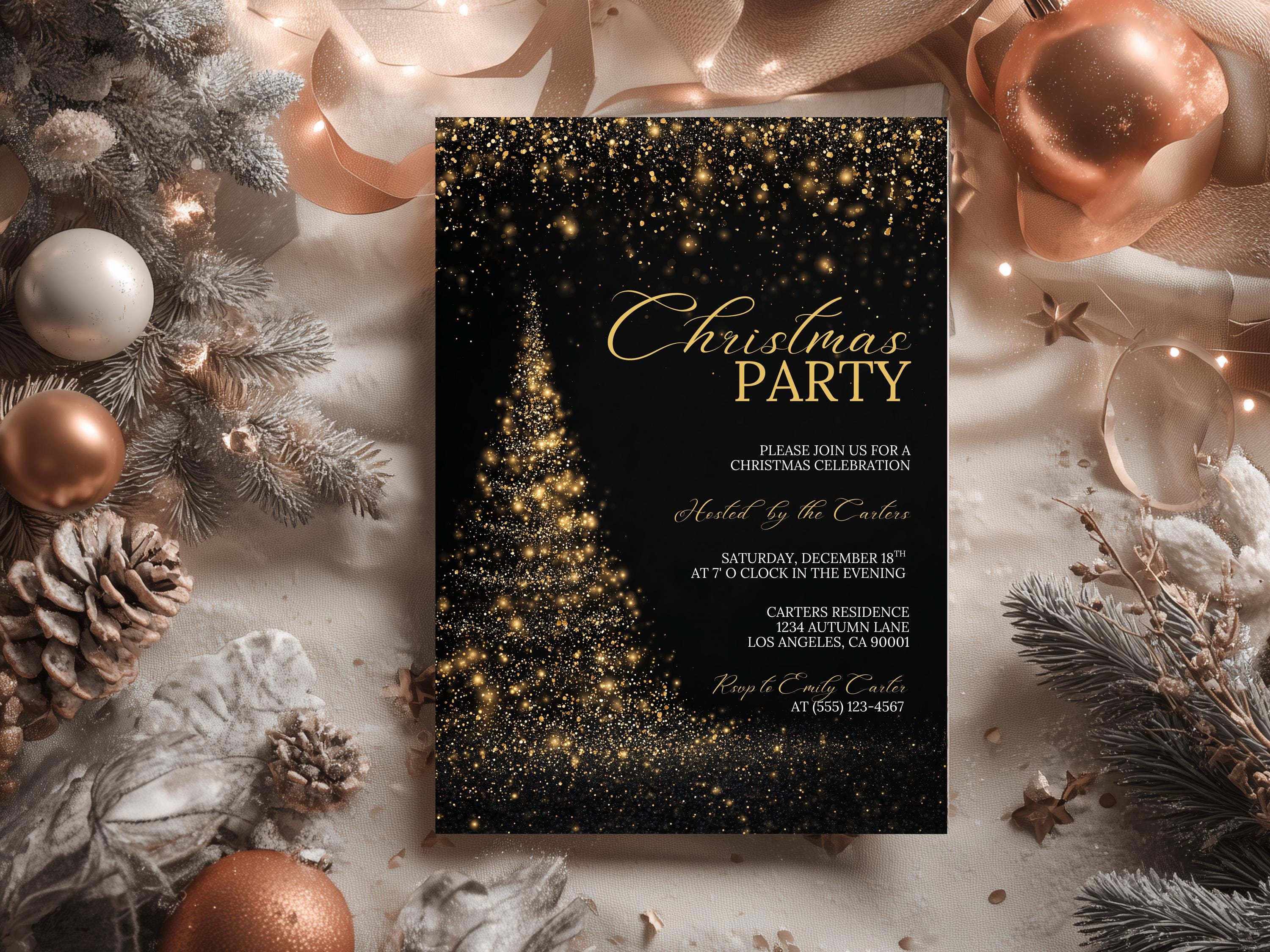 Add some sparkle to your celebration with this luxurious gold and black Christmas party invitation, designed for instant editing and printing. Perfect for office gatherings, family parties, or elegant holiday events.