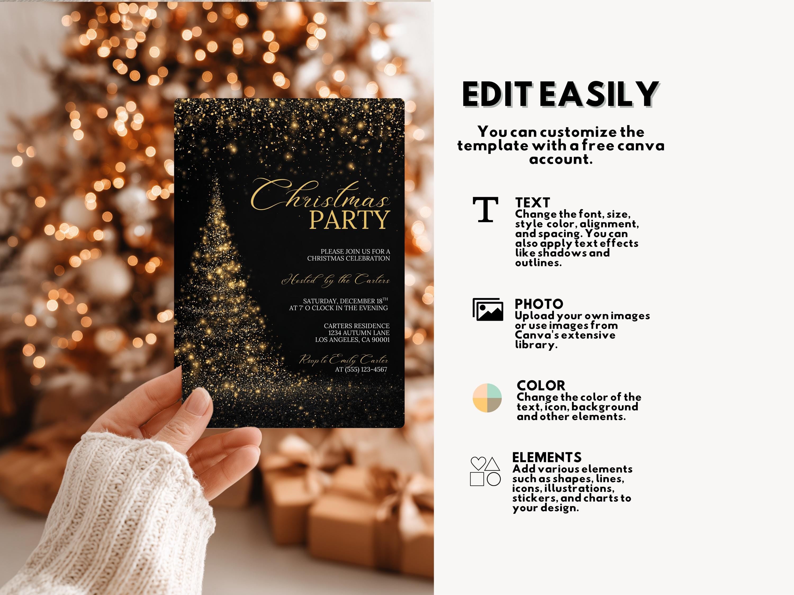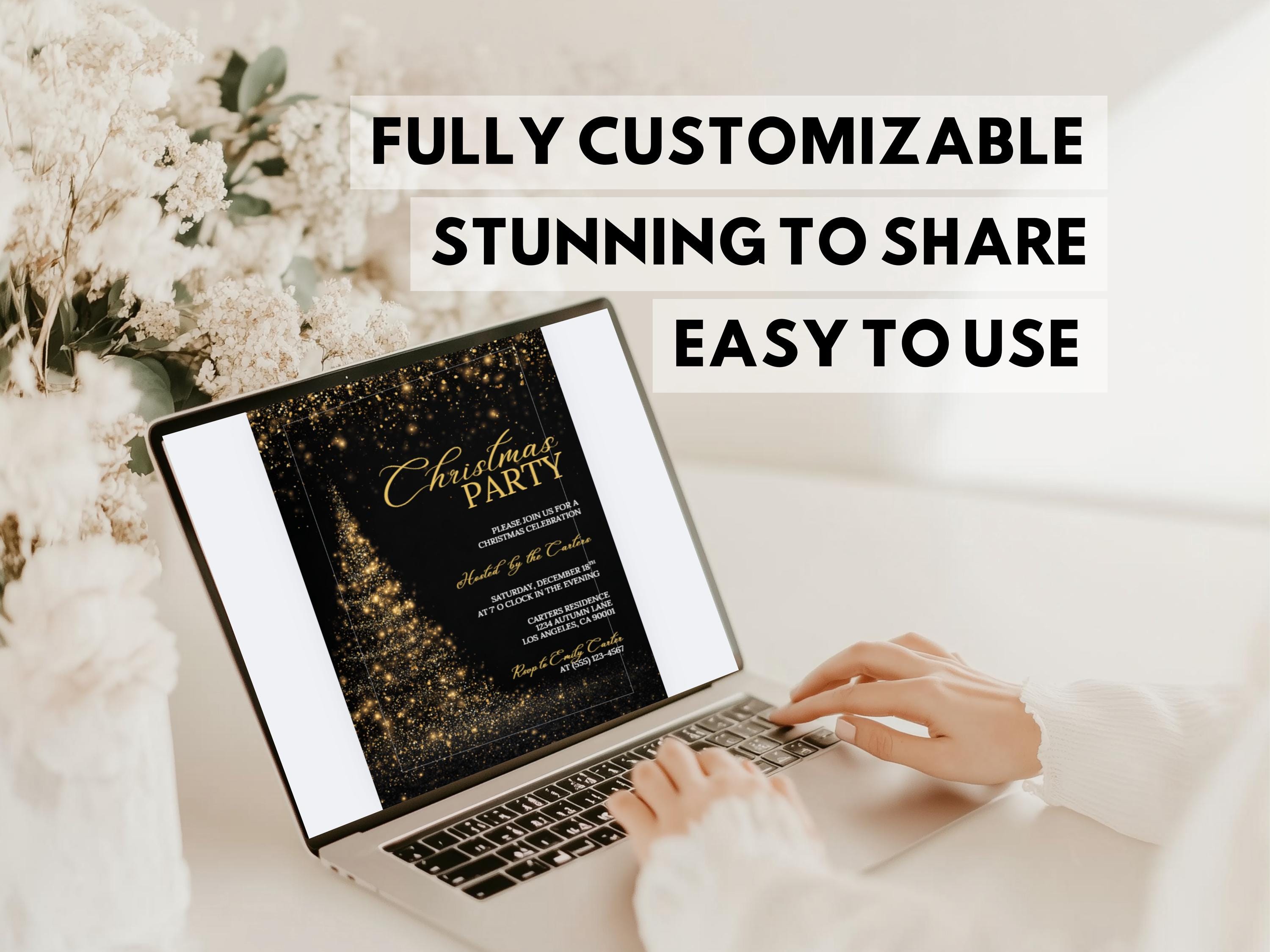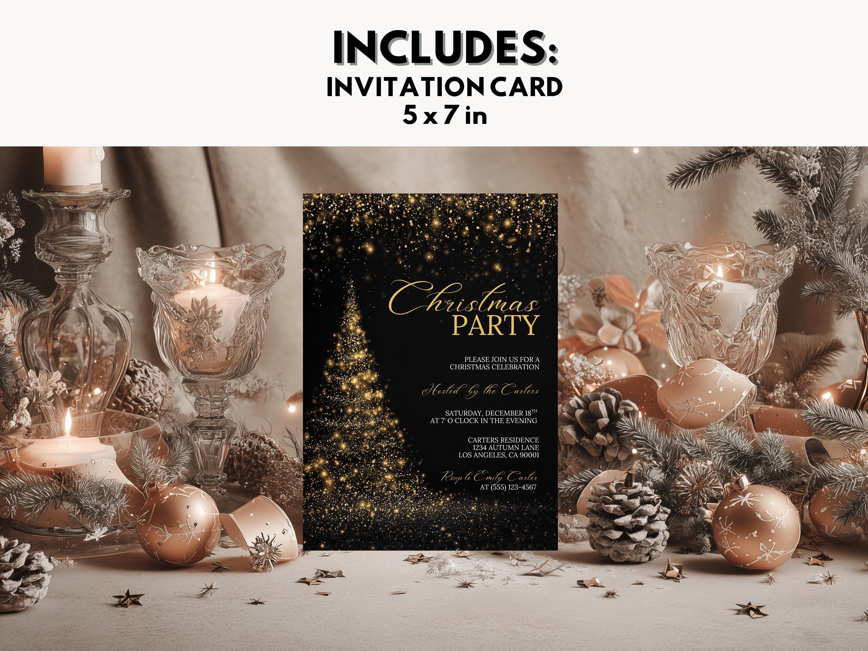 Add some sparkle to your celebration with this luxurious gold and black Christmas party invitation, designed for instant editing and printing. Perfect for office gatherings, family parties, or elegant holiday events.
