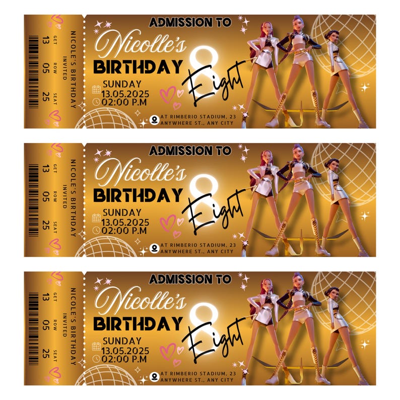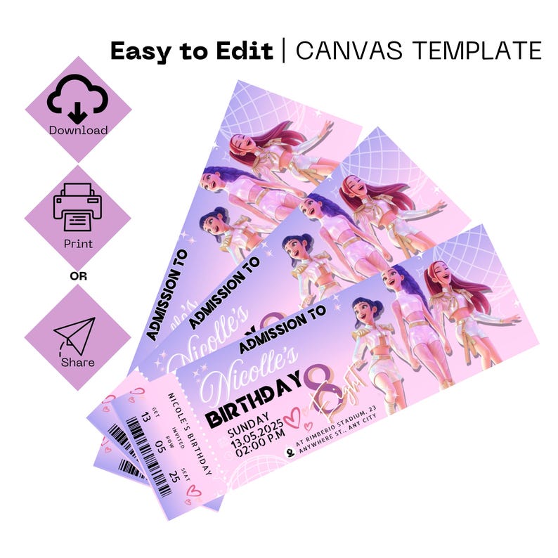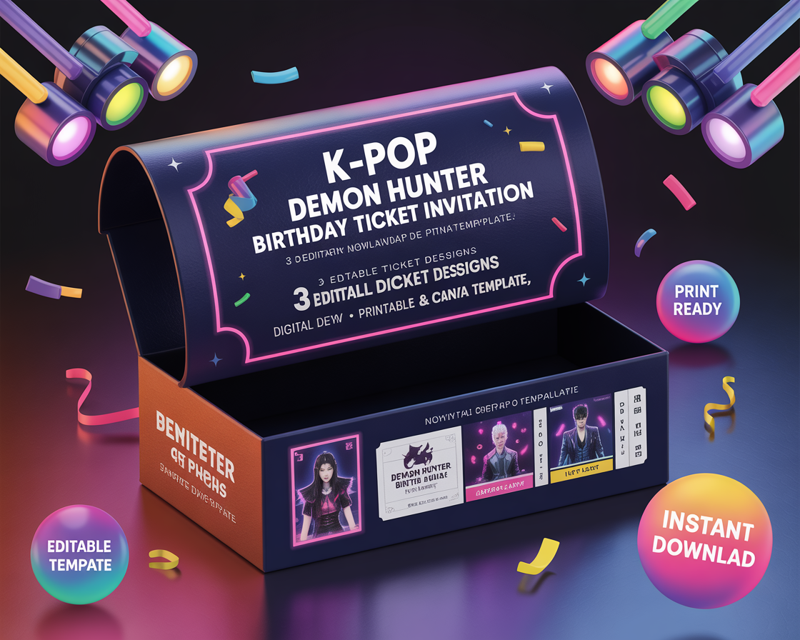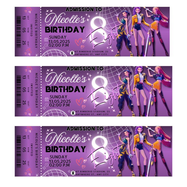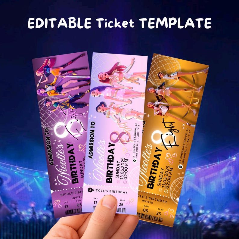 🎤 K-Pop Demon Hunter Birthday Invitation | 3 Editable Ticket Designs 🎉