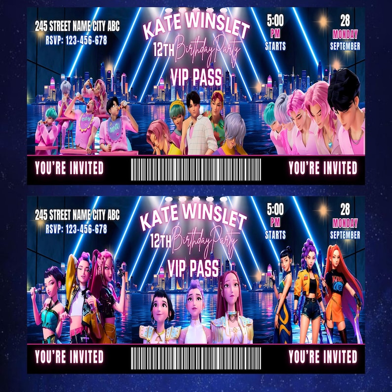Kpop Demon Hunters Birthday Bundle | Concert Style Party Pass | VIP Pass Digital Templates | 3 Editable Ticket Designs | Digital Download