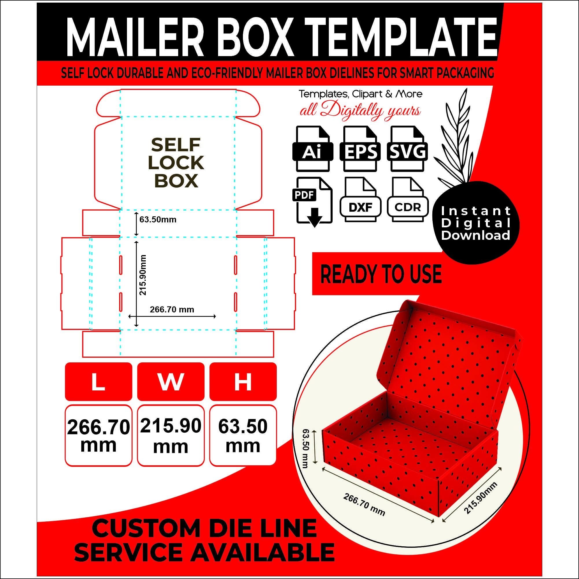 Layouts cover commonly used mailer sizes, including an assembled measurement of approximately 9.8 × 7 × 2.5 inches. All templates are fully editable in Adobe Illustrator, Inkscape, and other vector editors.